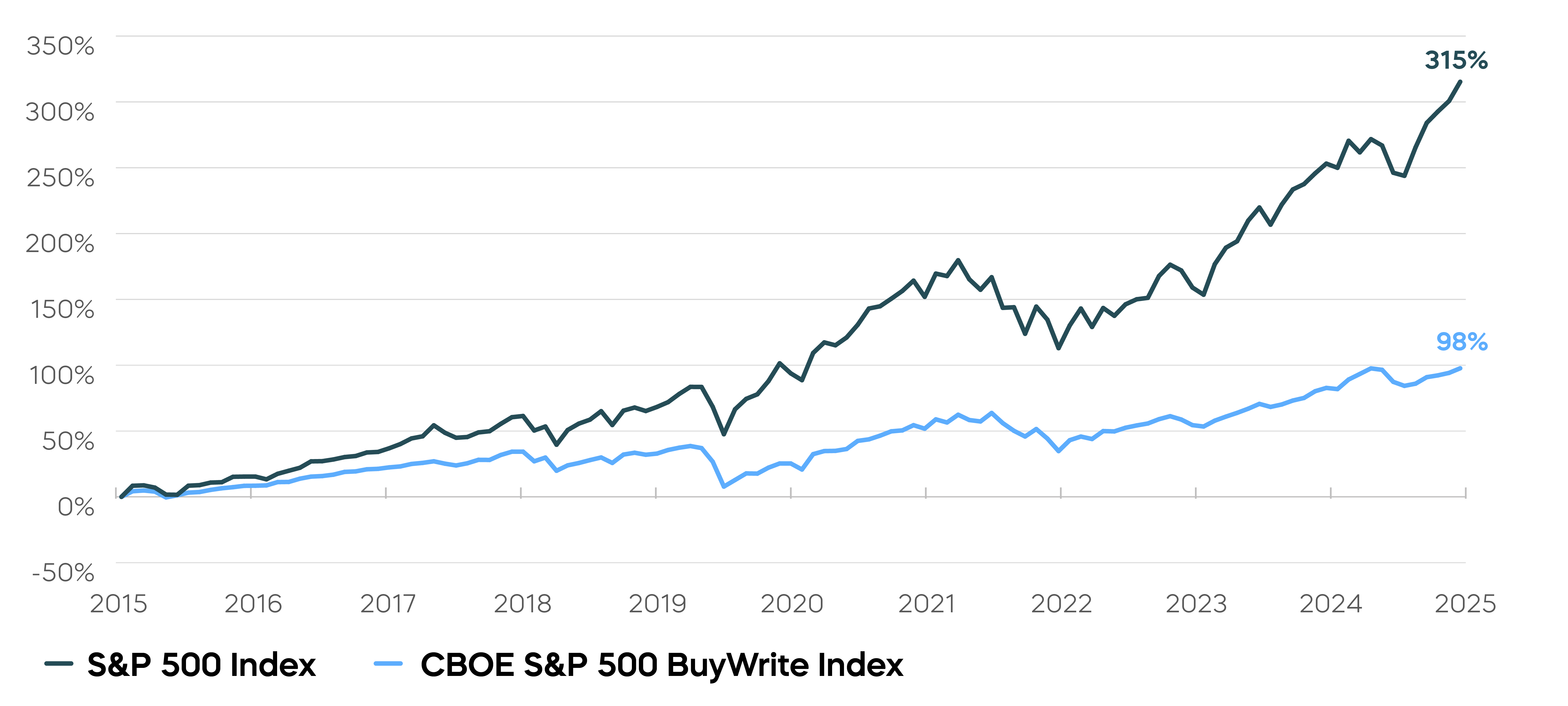 By capping the potential gains of an investment, covered call strategies create an inherent trade-off: The investor receives income from selling calls, but sacrifices long-term growth potential by capping the upside. In the case of traditional covered call strategies, this trade-off can be particularly costly over time.