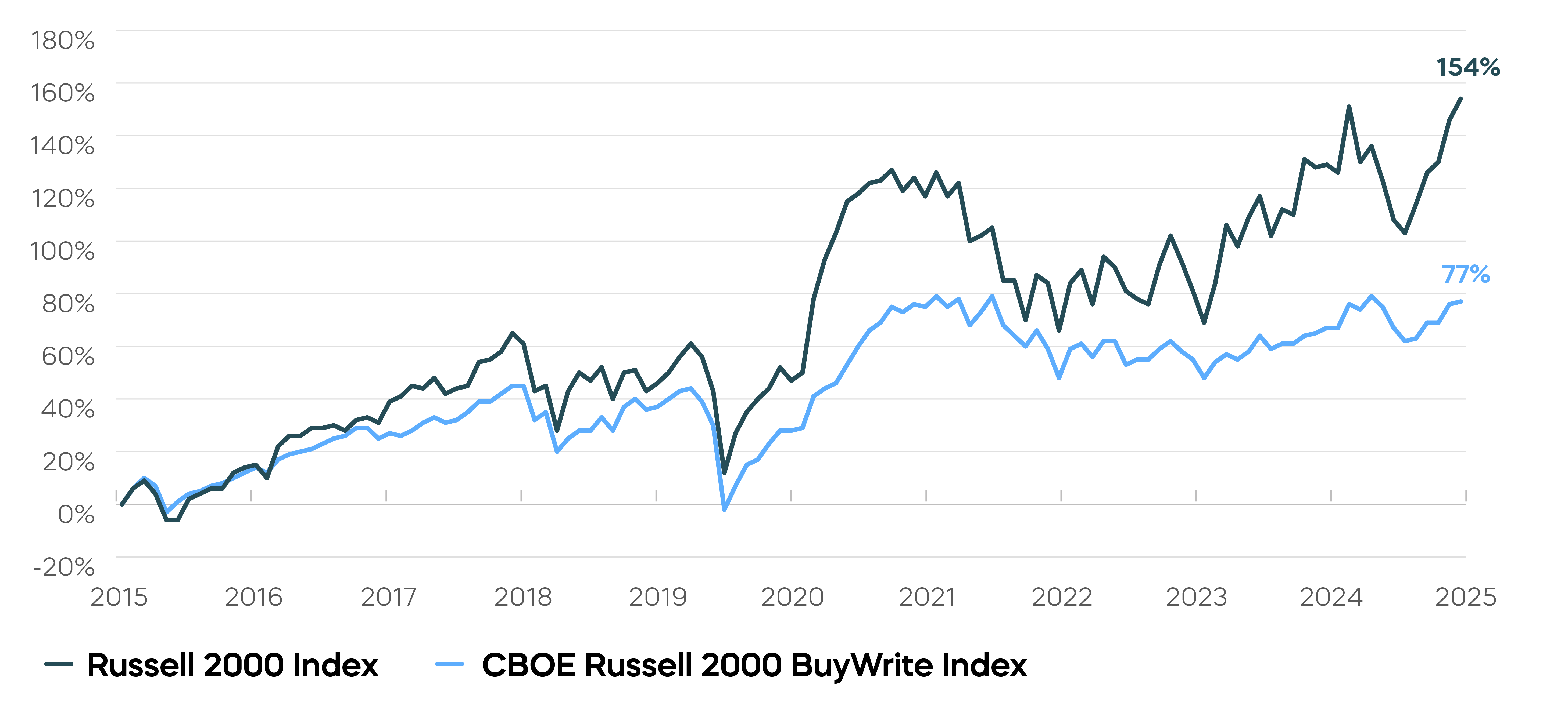 Comparing the performance between major benchmarks and their respective covered call indexes highlights this cost. The following page shows performance comparisons of the S&P 500 Index versus the CBOE S&P 500 BuyWrite Index, the Nasdaq-100 Index versus the CBOE Nasdaq-100 BuyWrite V2 Index, and the Russell 2000 Index versus the CBOE Russell 2000 BuyWrite Index. The CBOE BuyWrite indexes measure the performance of traditional, monthly covered call strategies on the S&P 500, the Nasdaq-100, and the Russell 2000, respectively.